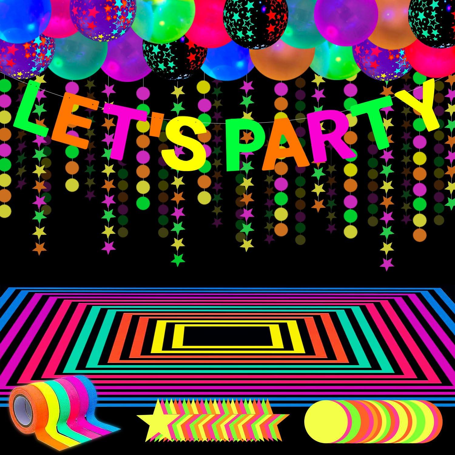 - Package Includes: 20 x 12 glow mixed color latex balloons; 20 x 12 black light reactive stars pattern balloons (10 purple, 10 black); 6 x colors neon gaffer cloth tapes( 1 yellow, 1 orange, 1 green, 1 pink, 1 purple, 1 blue ); 1 x neon paper circle dots garland; 1 x neon paper stars garland; 1 x glow in the dark banner; 2 x dot glues; 1 x balloon chain. This party set is sufficient for decorating your birthday party and will make your party shine. Both kids and adults will love them so much!