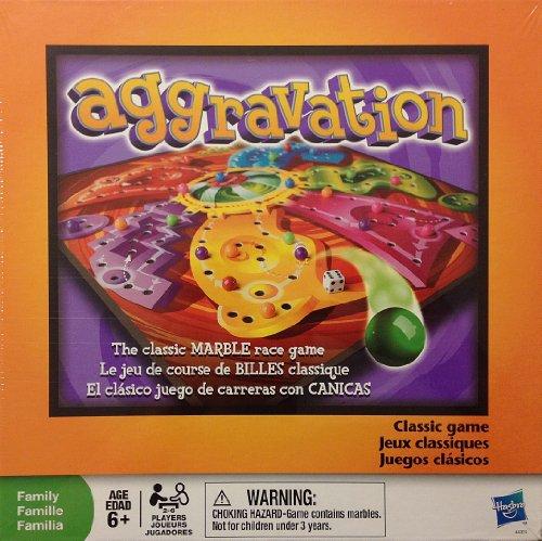 Hasbro Aggravation Classic Marble Race Game. Box includes: Gameboard, 1 Die, 24 Plastic Marbles and Instructions.