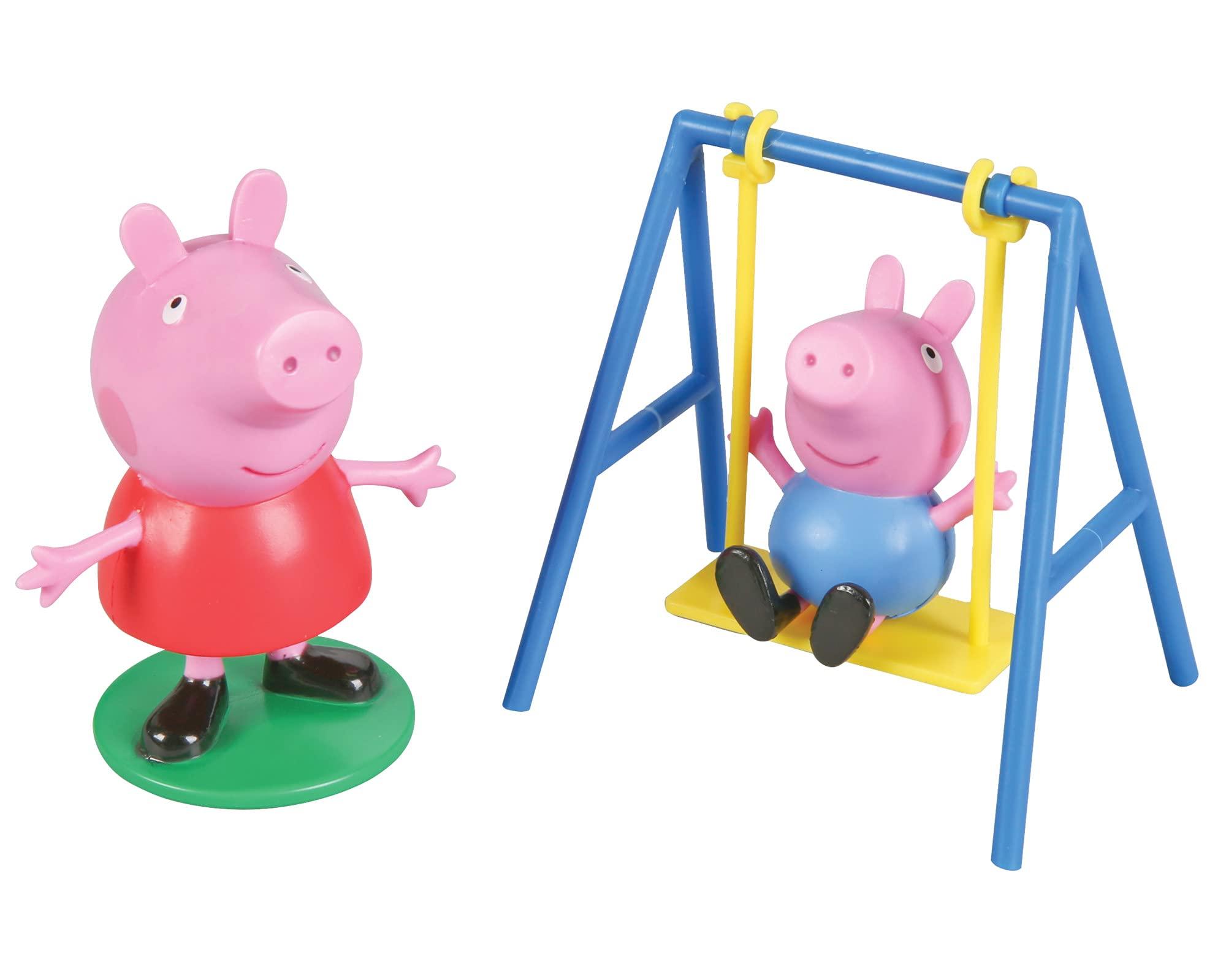 Peppa Pig keeps a close eye on his little brother George in this adorable cake topper! cake topper includes a Peppa Pig figurine and a swing set figurine with George in the swing for after party fun! 2-Piece set.