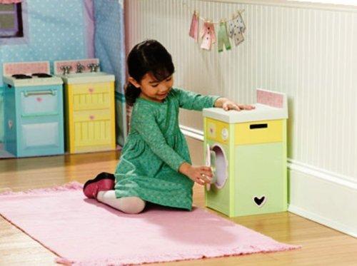 Little girls can pretend to do the laundry just like Mom and Dad with this adorable washer for use with the ROSE PETAL Cottage (sold separately). The durable fiberboard washer has turning knobs and an opening door to help spark your childs creativity and invite her into a magical world of make-believe. Pretend washer has knobs that turn and an opening door to help little girls pretend to do the laundry just like Mom and Dad!