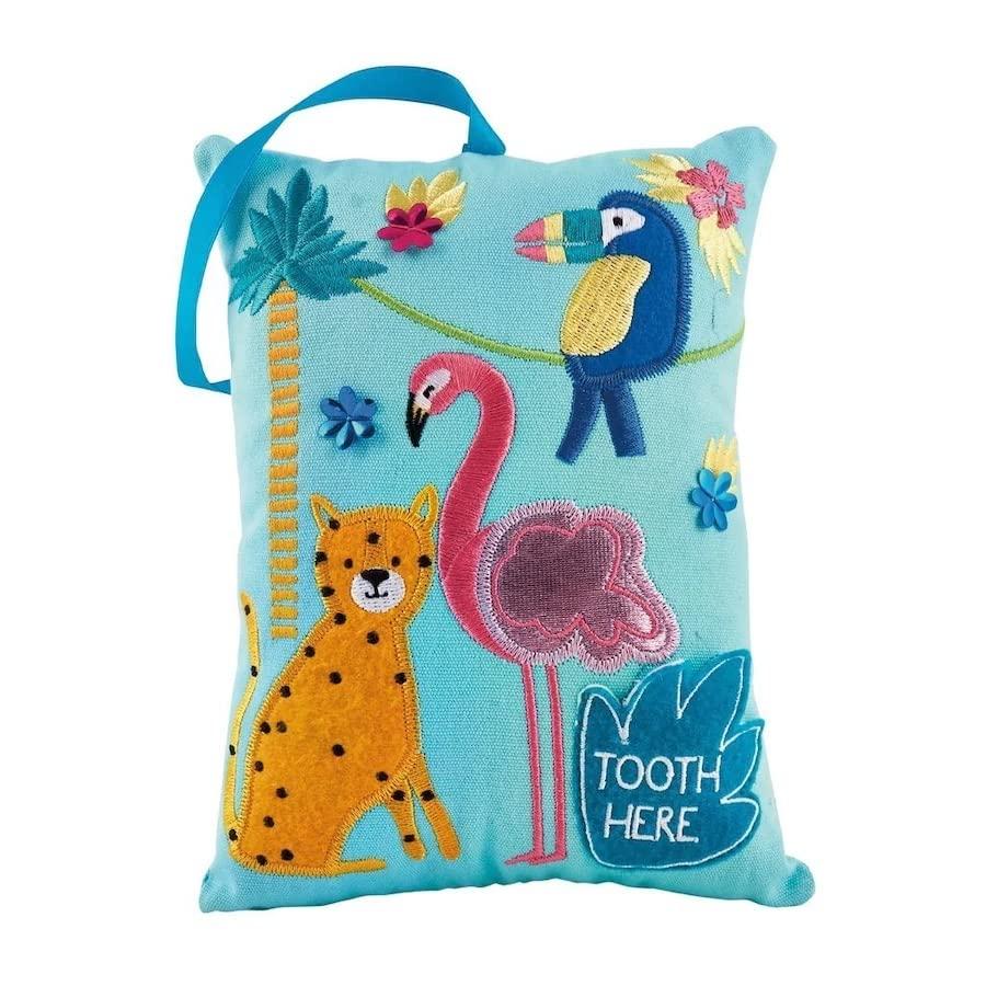 Beautiful embroidered Forest Animals Pillow with a leave design that says Tooth Here. The leave is a pocket for the lost tooth and for the tooth fairy to deposit the little tooth prize. Ribbon for hanging on the door knob (so easy for the tooth-fairy) or pillow can be placed in bed for the tooth fairy to find. Highly-detailed, this is a top-quality Tooth Fairy Pillow. Approximately 7" x 5" x 2.5". Floss & Rock is a company in Blackpool, England, where they create unique and fabulous gifts and toys for children. Their products are unique, beautifully-designed, educational and fun.