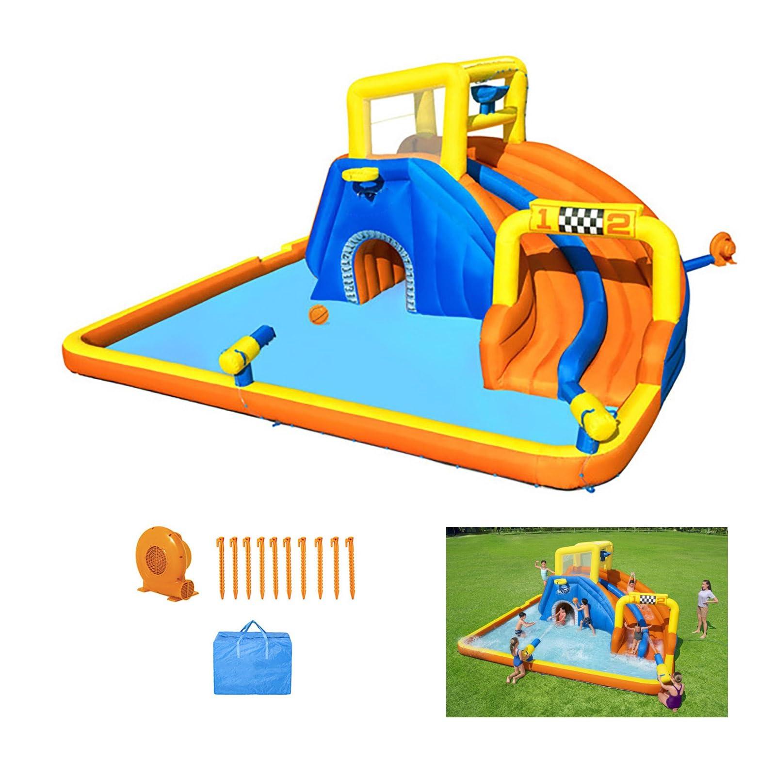 - Product size: The children's water castle inflatable swimming pool has a deployment size of 5.51 * 5.02 * 2.65m, and the castle comes with a water gun, slide, and basketball frame. It can help children have a perfect summer.