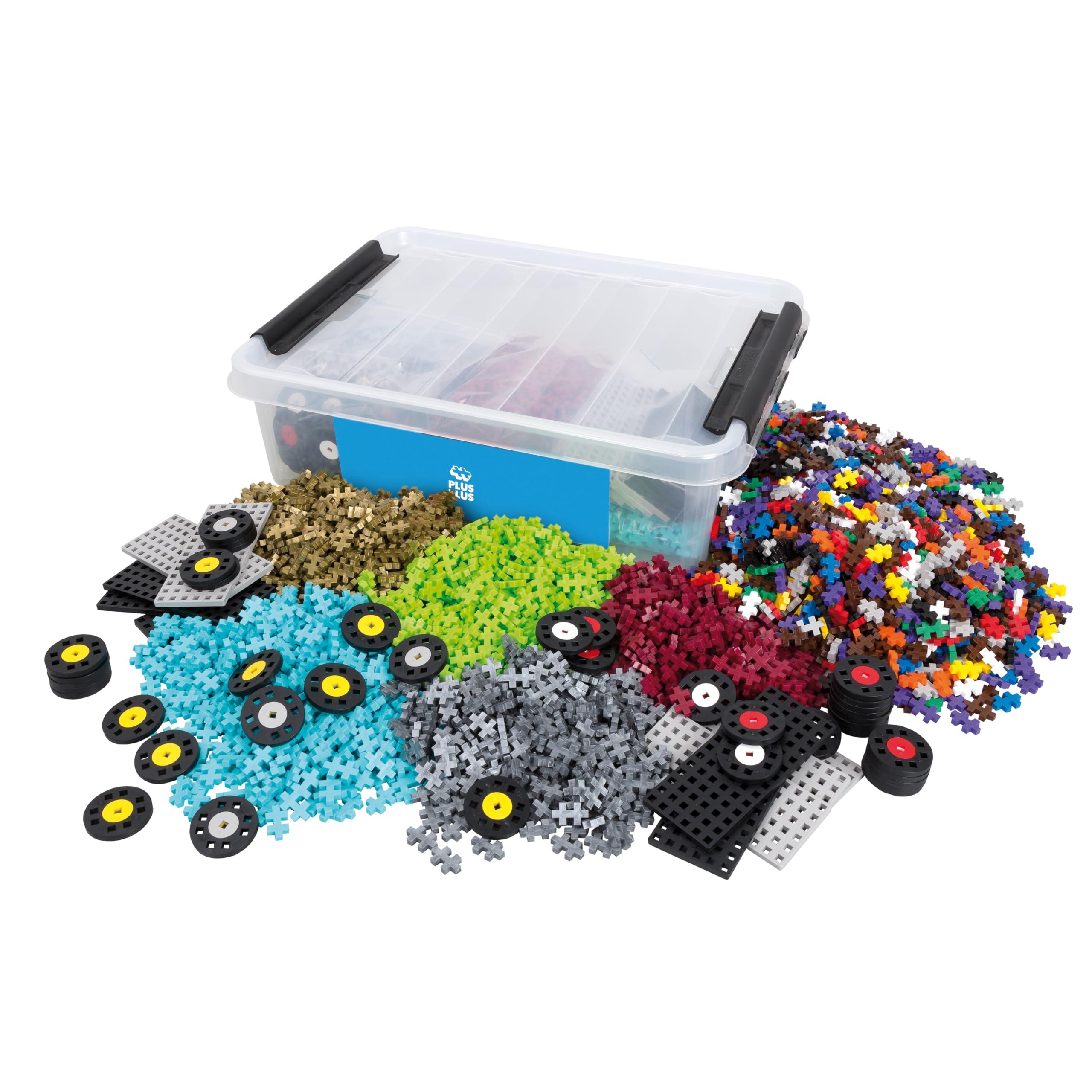 PLUS PLUS - GO! VEHICLES TUB - EDUCATIONAL - 2600 PIECES / 10 CHASSIS / 40 WHEELS. Plus-Plus is one shape with endless possibilities! The 2600 piece tub is a great way to get started with Plus-Plus. Kids and adults will learn to create in 2D or 3D, encouraging open-ended, creative play. This one simple shape is the key to unlocking endless creativity. Discover how to create flat mosaics and 3D builds. Its the perfect STEM toy to develop fine motor skills, focus, patience and encourage your imagination.. Get inspired by our pro builders' top tricks and tips, then build your own unique creations! Great for classrooms or large groups of young kids, tweens or 'kidults'. OVERVIEW: Includes: 2600 pieces (Mix of Red, Orange, Yellow, Purple, Green, Blue, Brown, Gray, White, Black, Metallic Gold, Metallic Silver, Lime Green, Maroon, and Turquoise colors), 10 Chassis Baseplates, 40 Wheels, A durable re-closable tub, Idea Guide Book. Made with 100% wind energy. BPA-free and phthalate-free. Suggested for ages 7+ Made with 100% wind energy. BPA-free and phthalate-free PLUS-PLUS is made in Denmark in our own zero-plastic-waste factory powered by renewable energy.