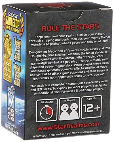 Star Realms is a spaceship combat deck building game designed by Magic Pro Tour Champions and Hall of Famers Darwin Kastle and Rob Dougherty (developer and cofounder of the Ascension Deck building Game). Star Realms offers all the thrills of traditional trading card game style combat, combined with the fun of a deck building game. Play powerful ships, destroy enemy bases or blast your opponent directly on your way to victory! CONTENTS 128 beautifully illustrated cards: 80 card main deck, 10 Explorer cards, Two 10 card personal decks, 18 double sided score cards And two full color rule sheet.