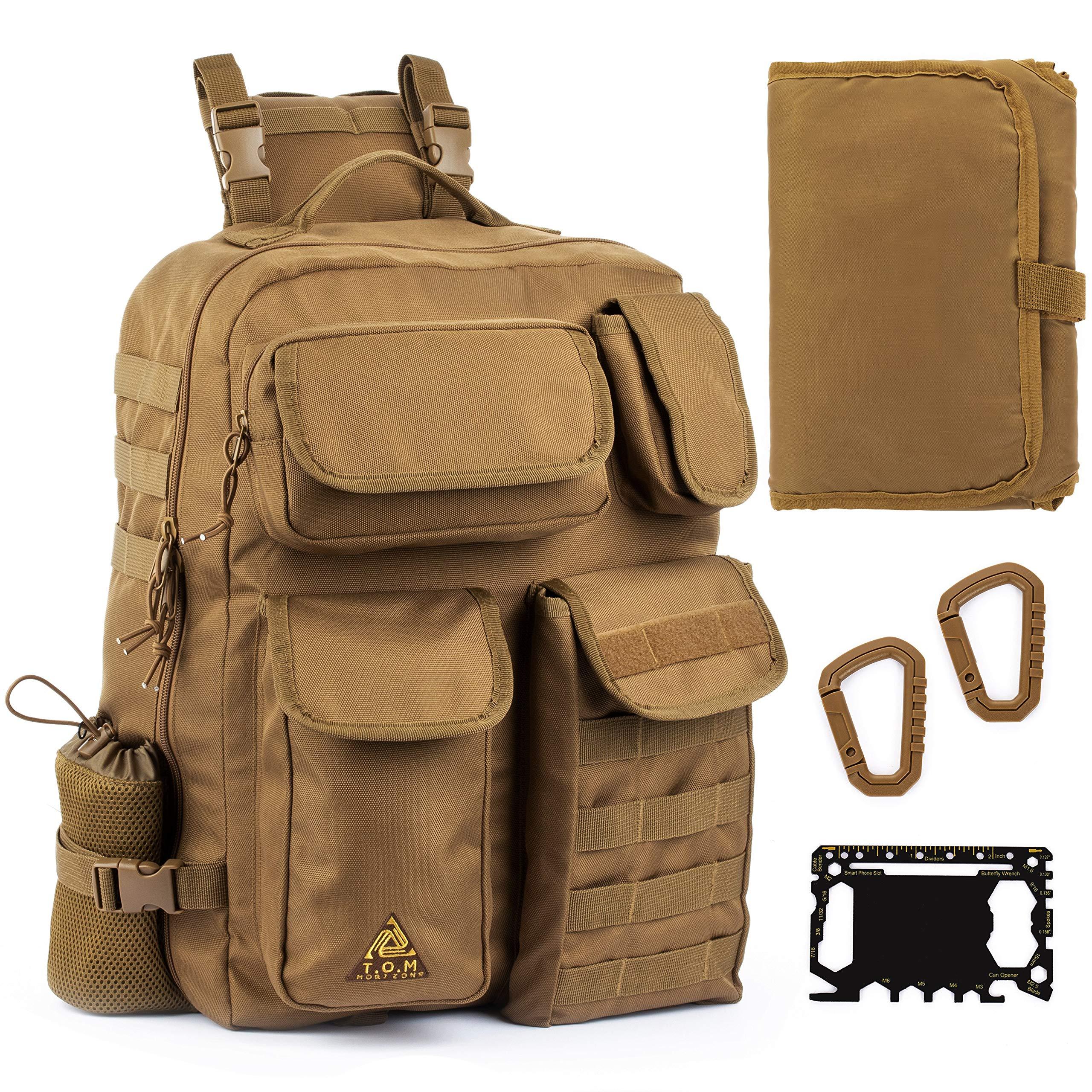 - MUST-HAVE ACCESSORIES AND BONUS: This diaper bag/mens backpack attaches to your stroller with designated straps and still provides access to the compartments. It also comes with 2 carabiners to hang essentials from the MOLLE straps on the front and sides of the bag. An easy to clean 31 x 19 waterproof changing pad is also included. FREE BONUS - Credit Card Multi-tool with up to 46 tools in one including screwdrivers, wrenches, knife, bottle can opener and more.