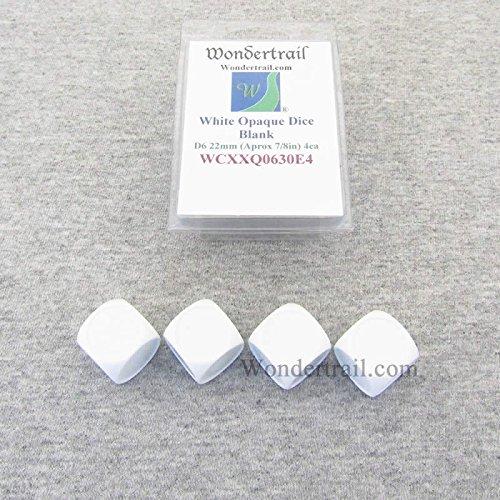 WCXXQ0630E4 White Blank with Indented Faces D6 Aprox 22mm (7/8in) Pack of 4 Wondertrail\n\n - Pack of 4 Dice 22mm six-Sided (d6)\n - These dice are blank and do not have pips or numbers.\n - Opaque white dice.\n - These dice are 6 sided dice with rounded corners and approximatley 22mm - 7/8in in size.\n- Dice packed in a blister.\n\nNOTE: Colors may vary slightly depending on your monitor settings.\n\nMake sure your dice are packed in blisters by Wondertrail\nWondertrail, Wondertrail.com, and the Wondertrail Logo are registered tradmarks of Community Outlet LLC\nDice manufactured by Chessex